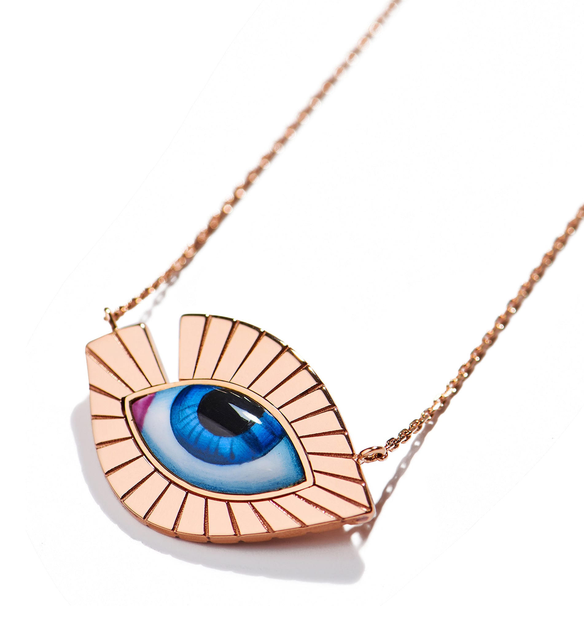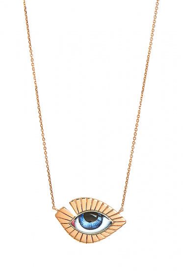 14K pink gold “Mexican Petit Bleu” necklace with small blue enameled eye.